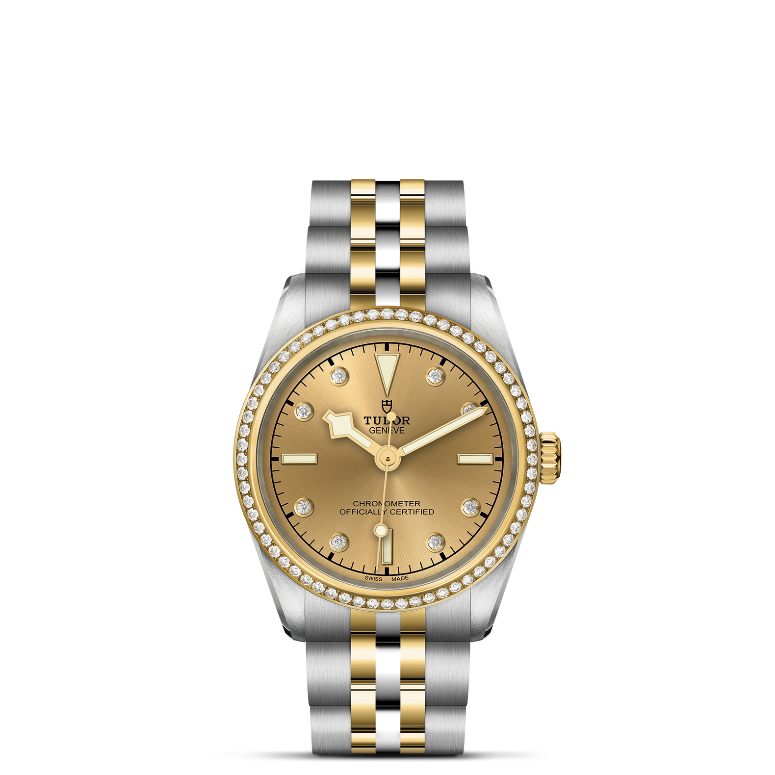 First center links in steel or solid yellow gold. Remaining center links in steel or steel covered by a 0.2mm yellow gold cap. TUDOR ""T-fit"" folding clasp with safety catch. The logo on the catch is made of solid yellow gold