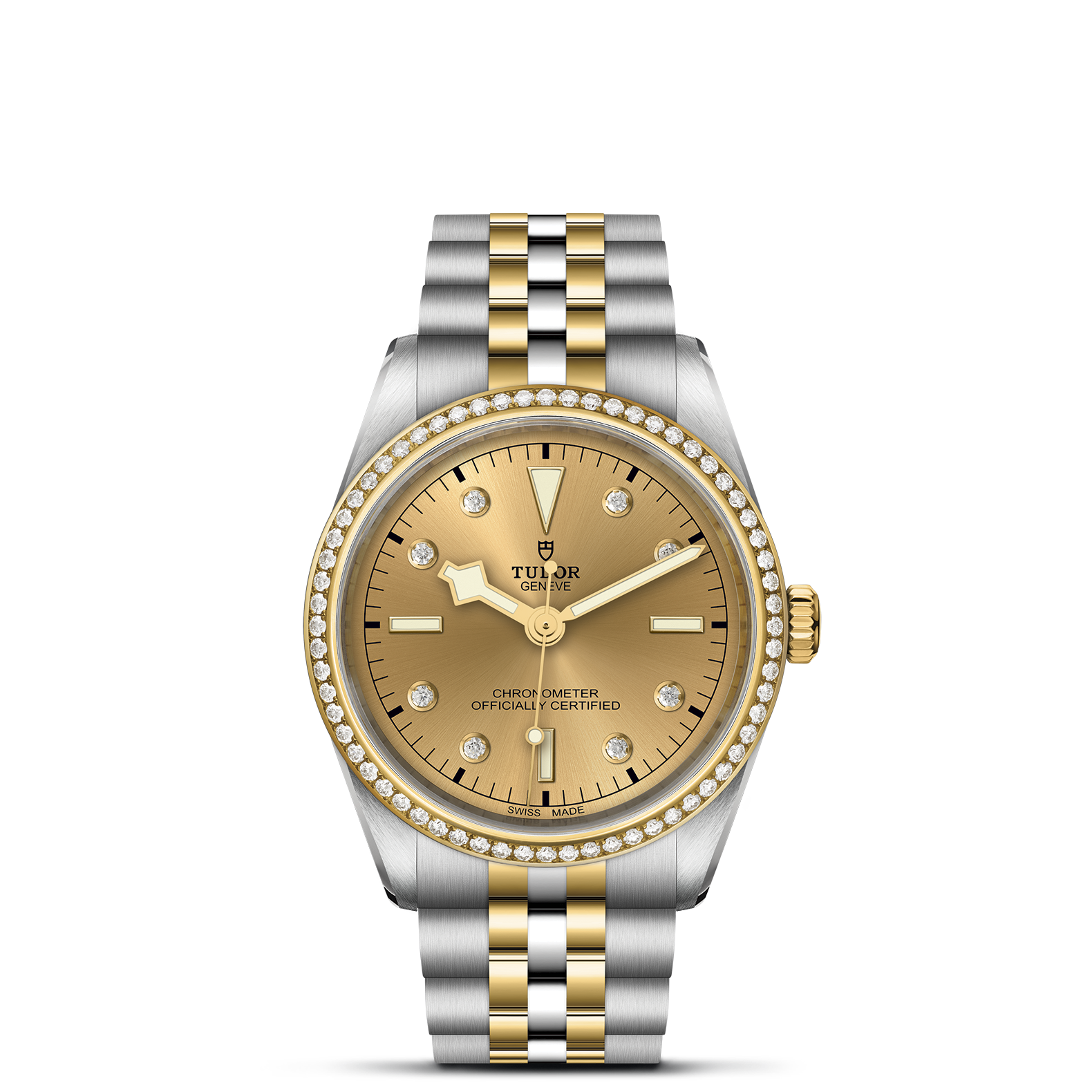 First center links in steel or solid yellow gold. Remaining center links in steel or steel covered by a 0.2mm yellow gold cap. TUDOR ""T-fit"" folding clasp with safety catch. The logo on the catch is made of solid yellow gold